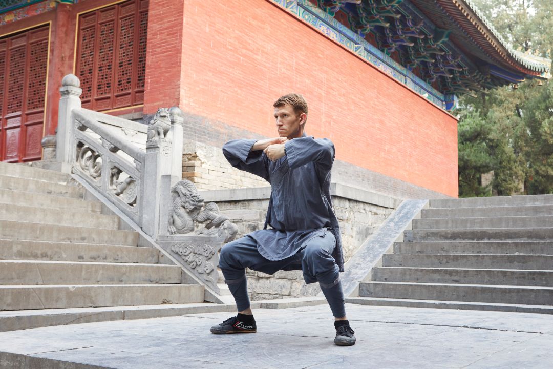 На видео инструкторы Пётр Ивлиев и Роман Архипов выполняют движения цигун-комплекса Ицзиньцзин на тренировочном сборе в монастыре Шаолинь в 2024 году.